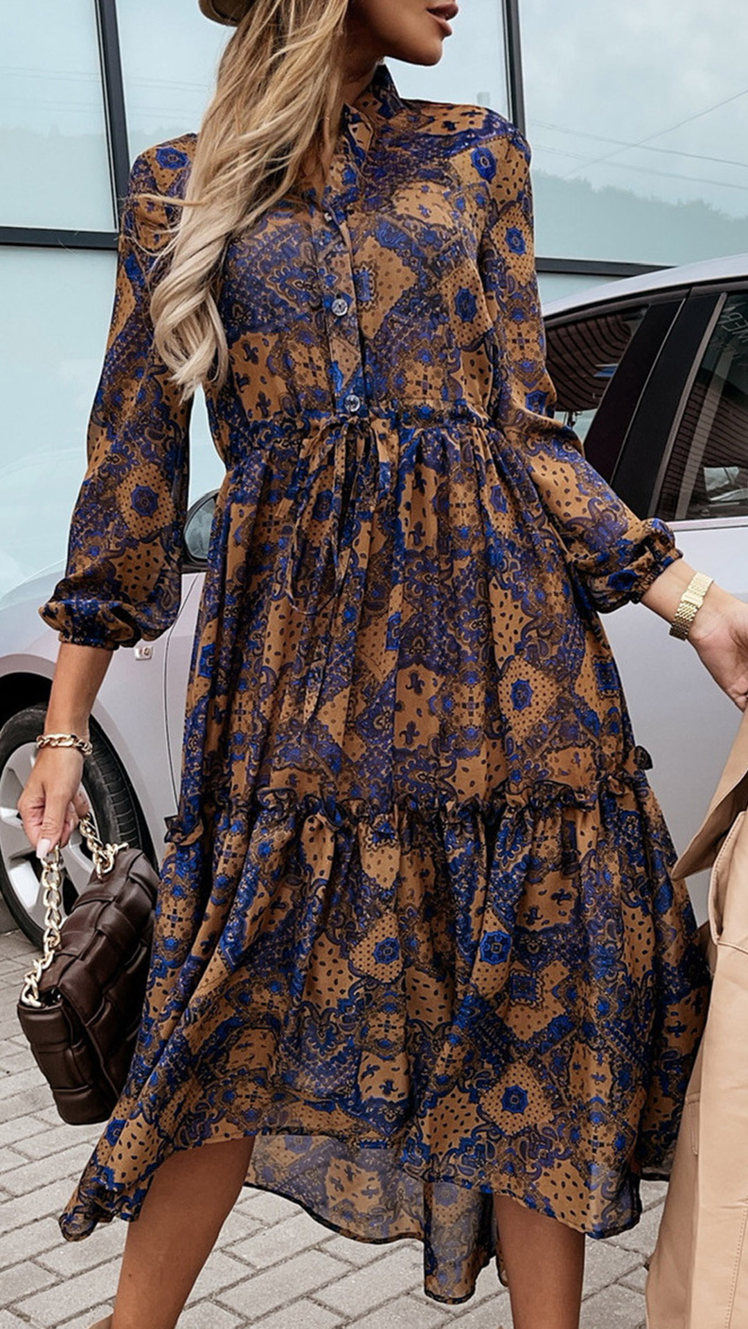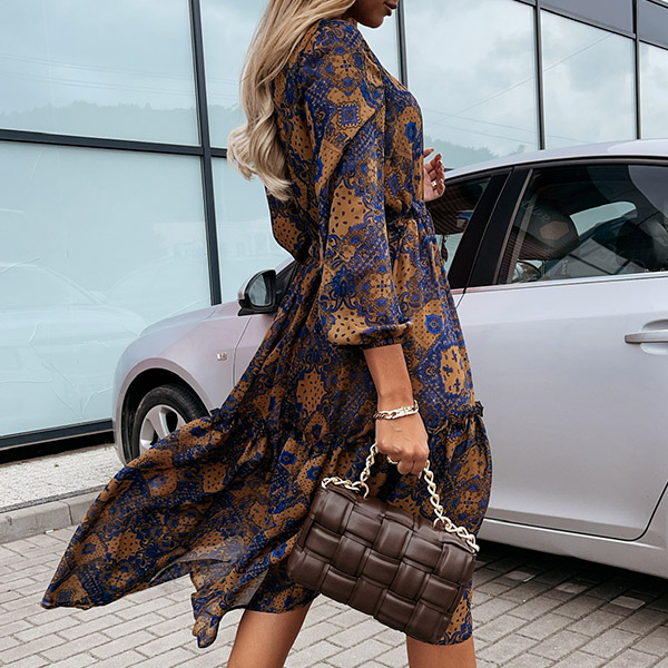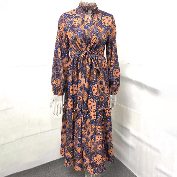 Retro Style Long Sleeve Ruffle Stand Collar Printed Dress