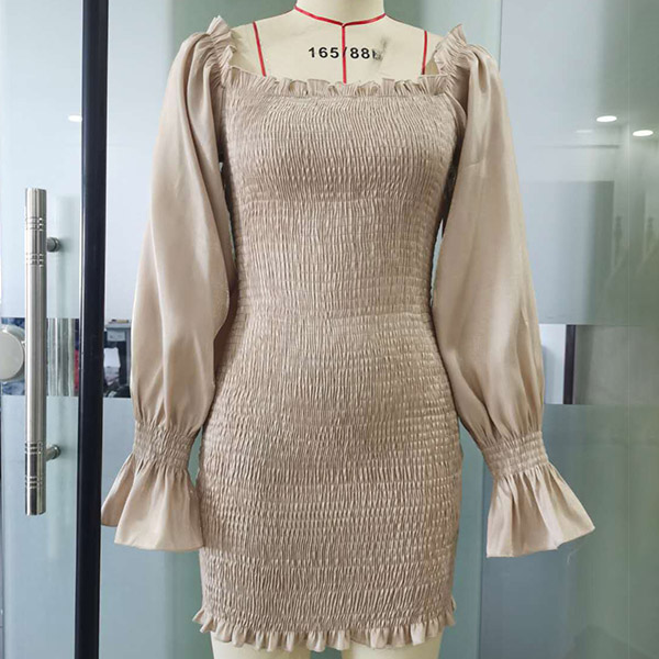 Retro Style Long Sleeve Square Collar Solid Color Slim Fit Wrinkled Dress