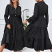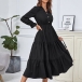 Retro Style Long Sleeve V-neck High Waist Solid Color Cake Dress
