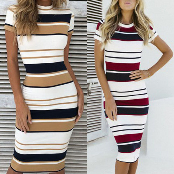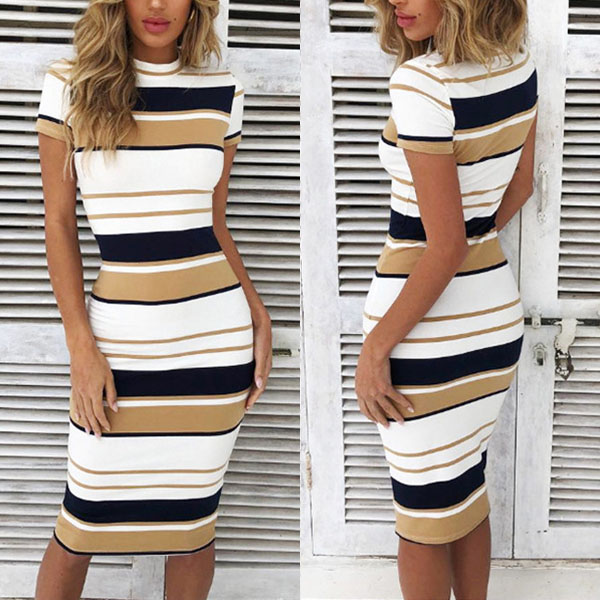 It is a good chance to update your summer wardrobe with this short sleeve dress. The stripe element design makes it look so stylish and attractive. Finished with round neck and a fit silhouette,this dress definitely knows how to portray your slender figure.