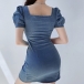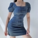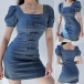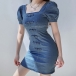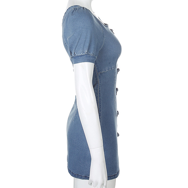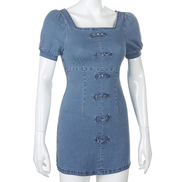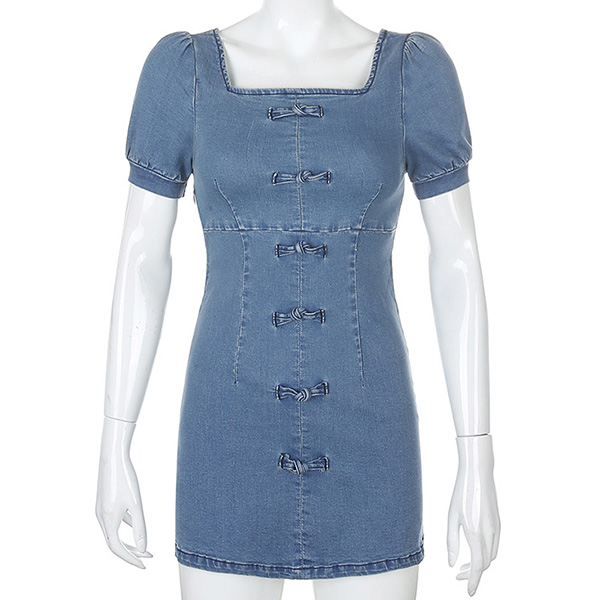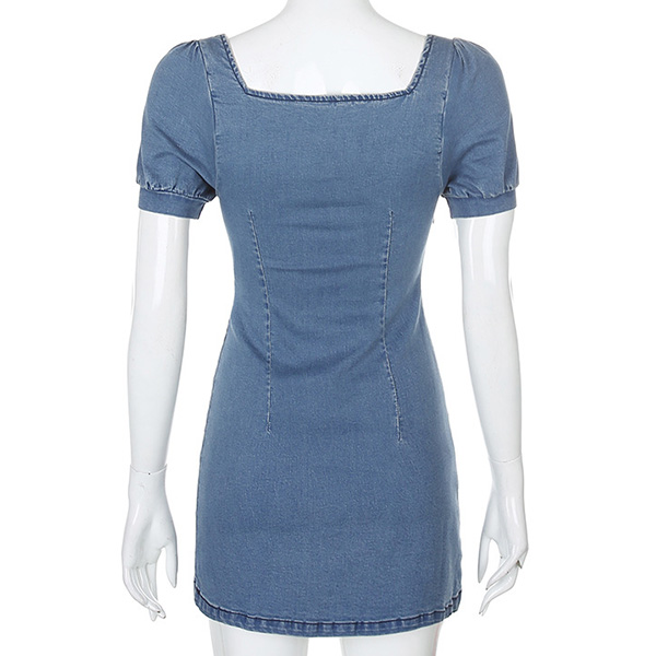 Retro Style Short Sleeve Square Collar Slim Fit Denim Dress