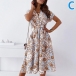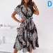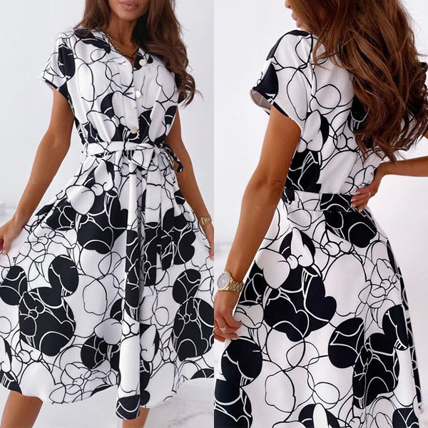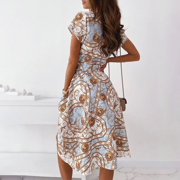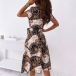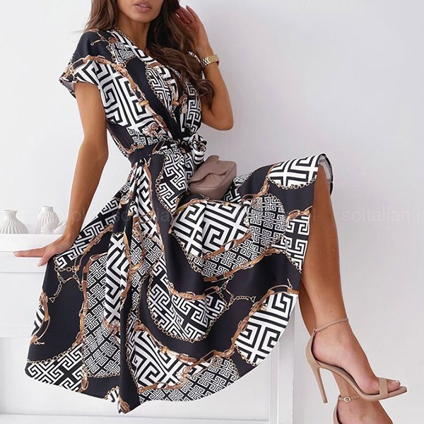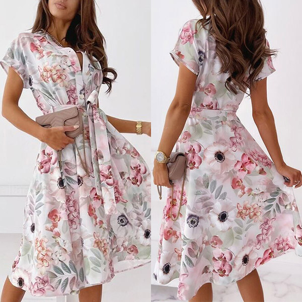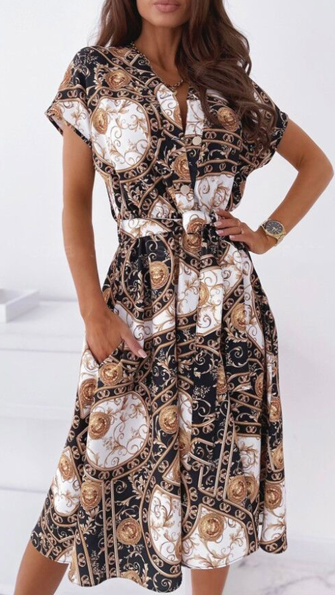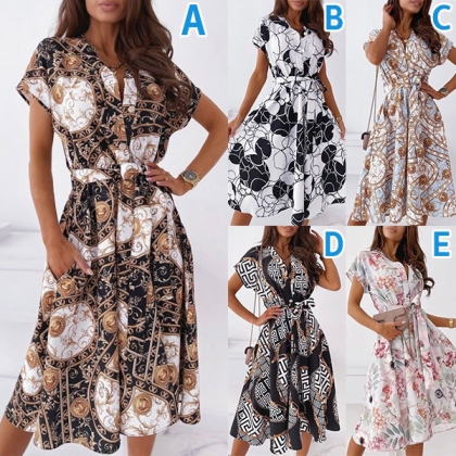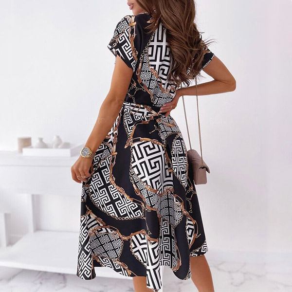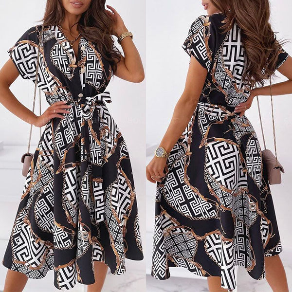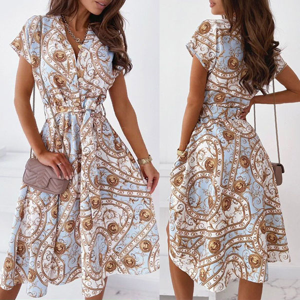 Designed with chic and retro printed details,this dress is sure to help you arouse more attention. Finished with short sleeve and v-neck design,this dress definitely can enhance your feminine appeal. The high waist with waist strap design can better highlight your slender figure. From your daytime out to night dating,this dress can give you a perfect transition.