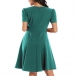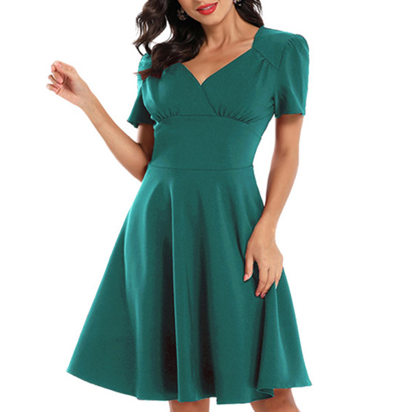 Retro Style Short Sleeve V-neck High Waist Solid Color A-line Dress