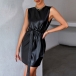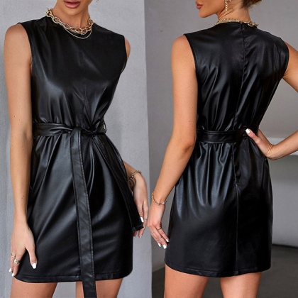 Retro Style Sleeveless Round Neck Slim Fit PU Leather Dress with Waist Strap