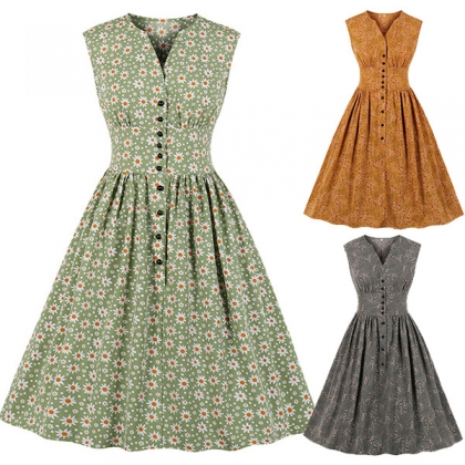 Retro Style Sleeveless V-neck High Waist Printed Dress