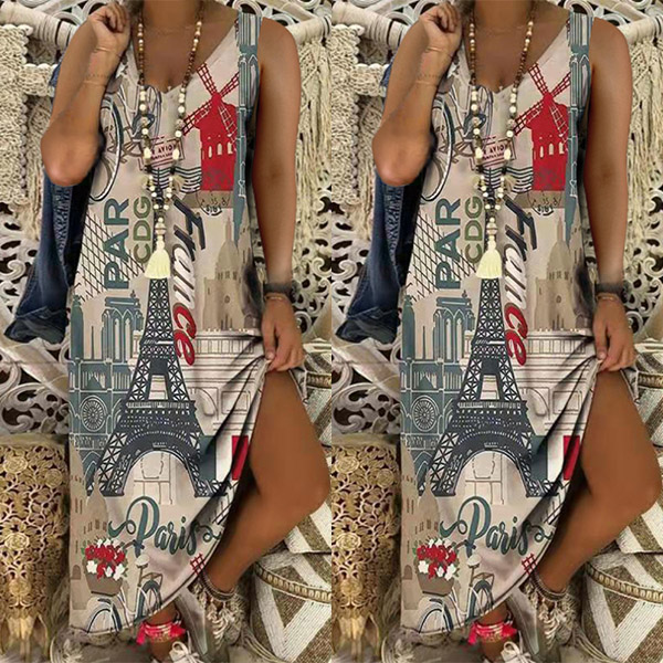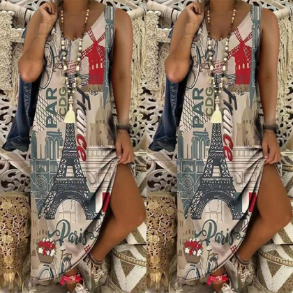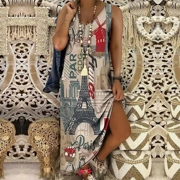Retro Style Sleeveless V-neck Slit Hem Printed Beach Dress