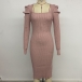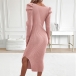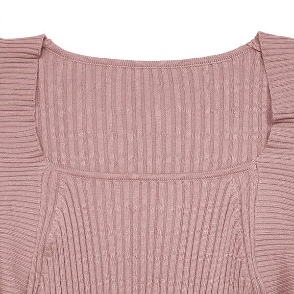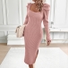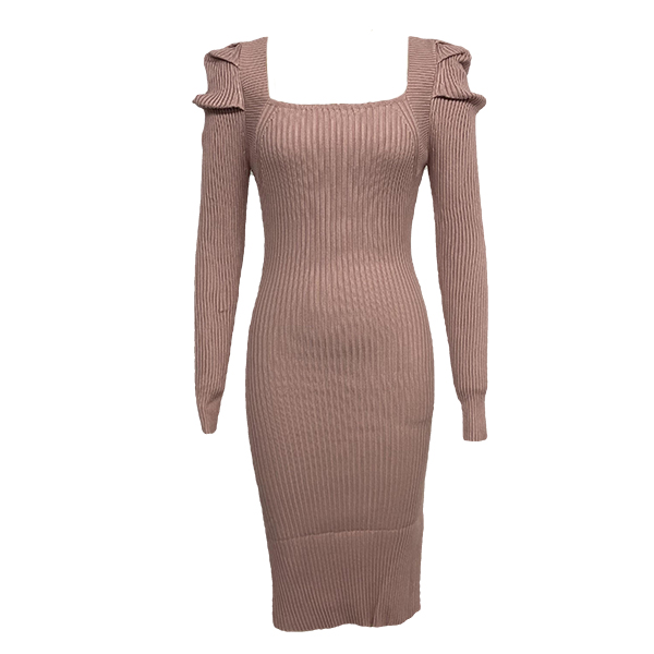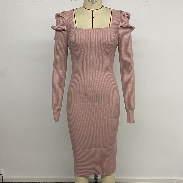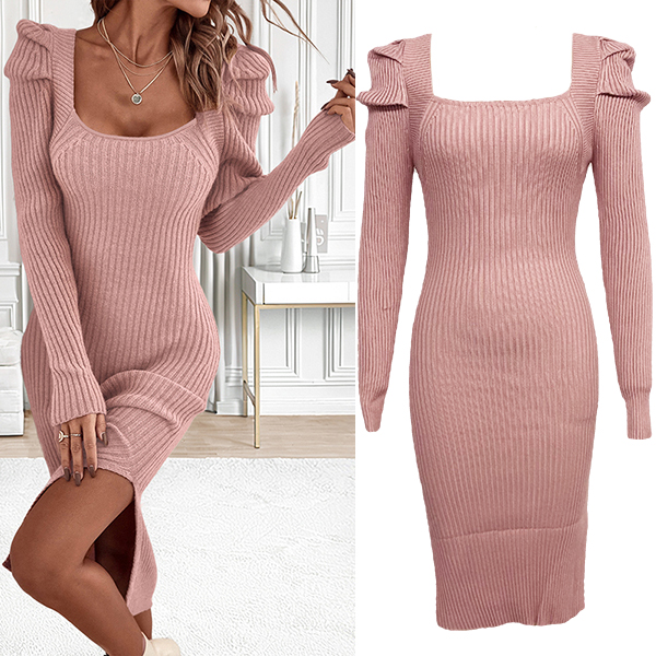 Fashion Square Neck Puff Long Sleeve Side Slit Bodycon Ribbed Dress