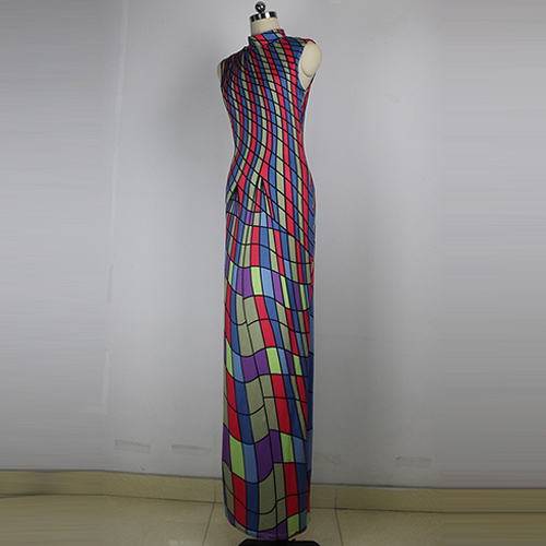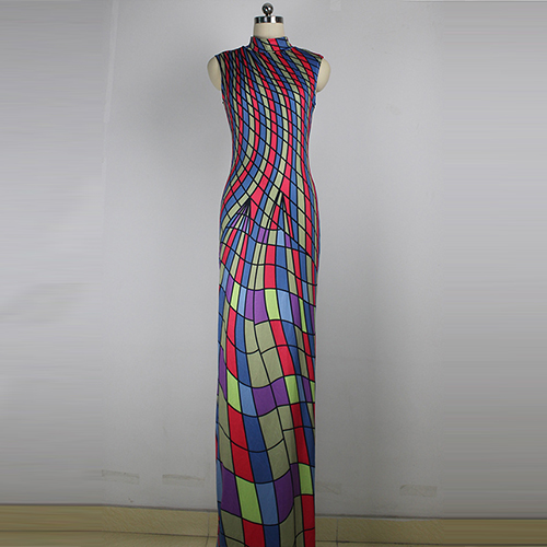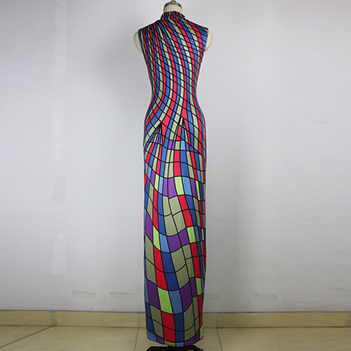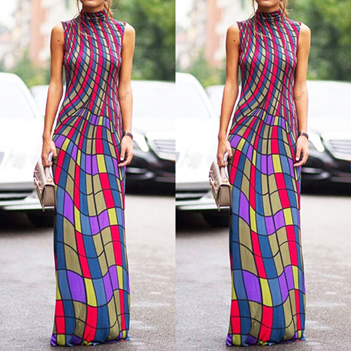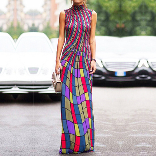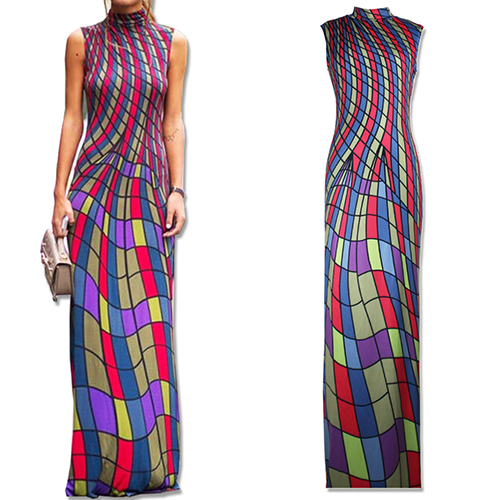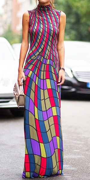 maxi dress is crafted in mock neck, sleeveless and striped printed design, sexy and elegant. Retro style,