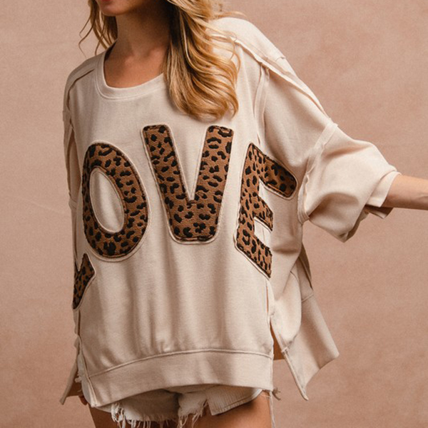 Romantic Leopard Printed Letter-LOVE Crew Neck Batwing Sleeve Side Slit Sweatshirt