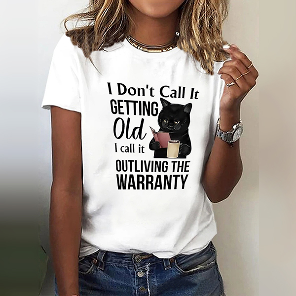 Round Neck Short Sleeve T-Shirt with Black Cat Print