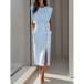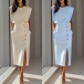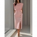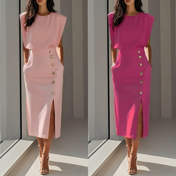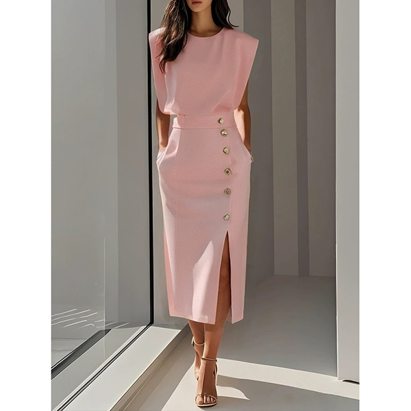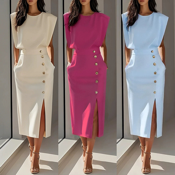 Round Neck Sleeveless Solid Color Long Dress with Button Detail and Slit