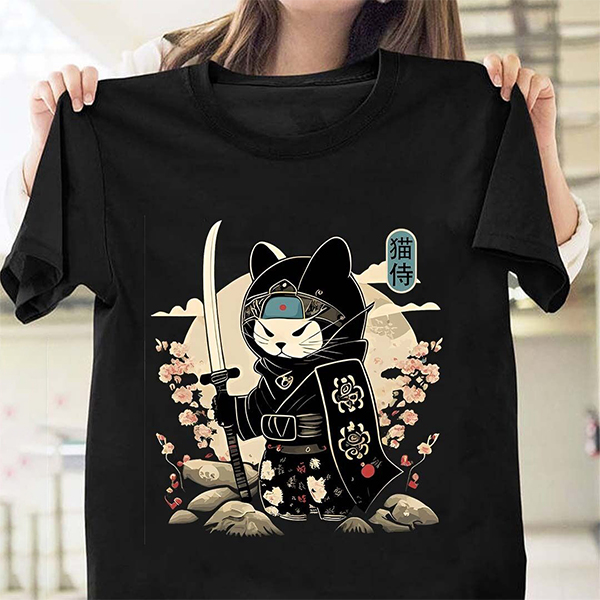 Sakura Full Moon Cat Samurai Design T-Shirt