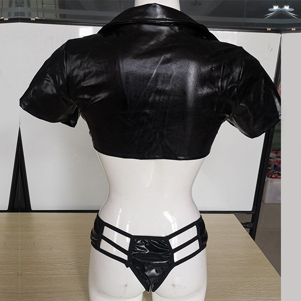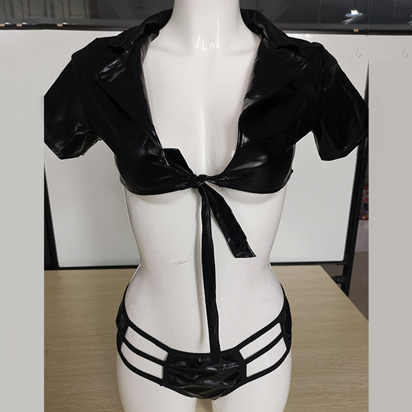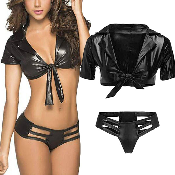 Sexy Artificial Leather PU Two-piece Lingerie Set Consist of Self-tie Crop Top and Cutout Panties