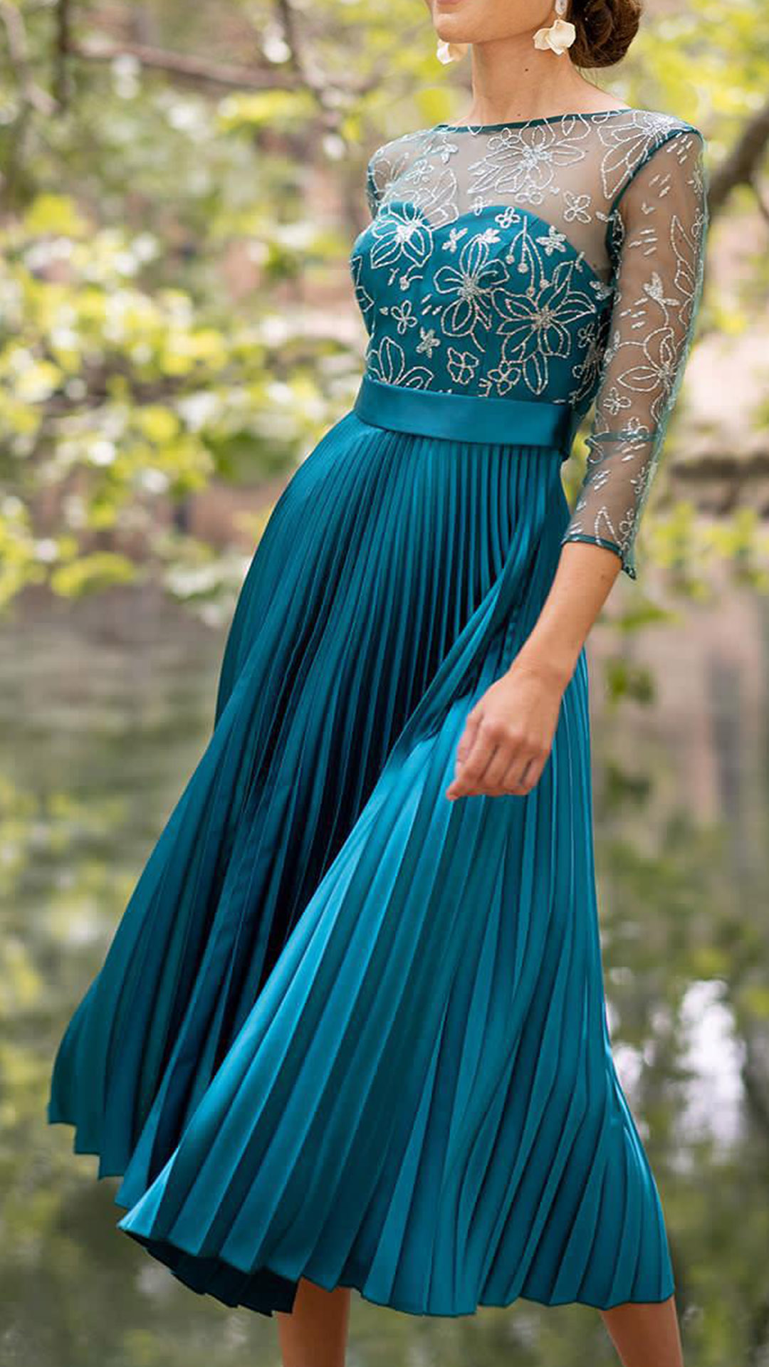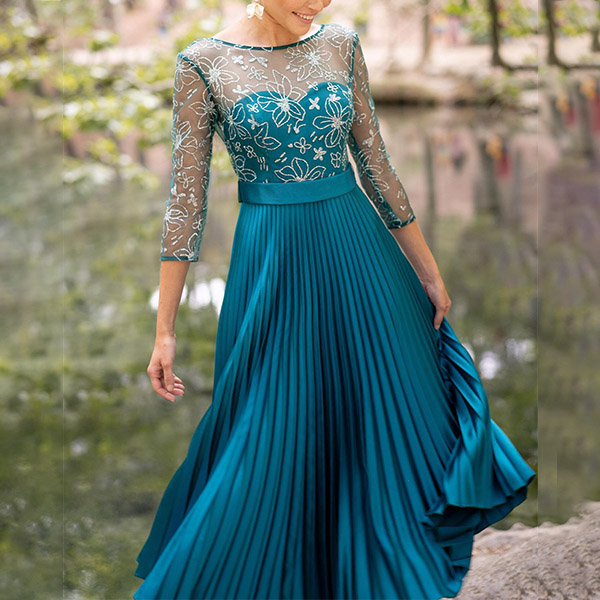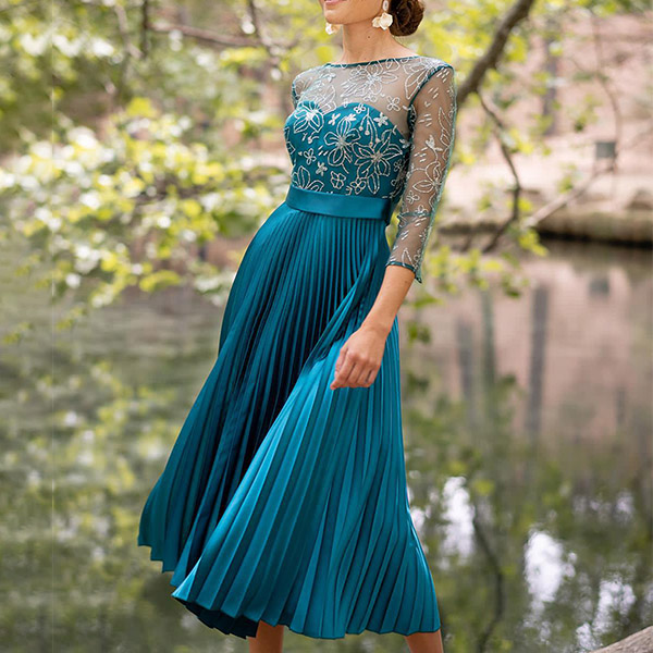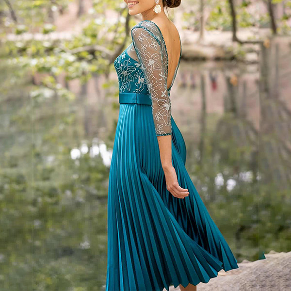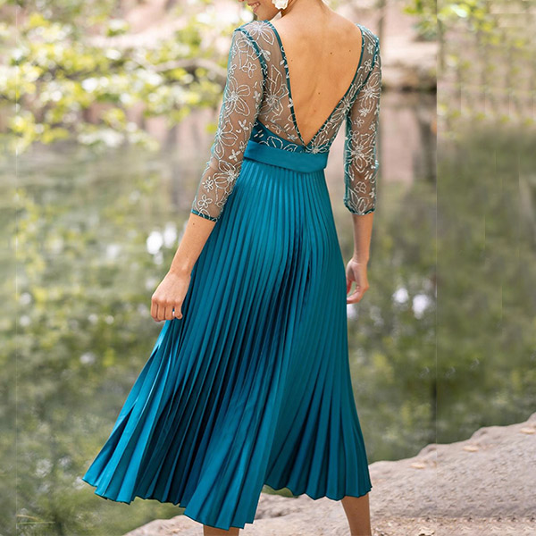 Sexy Backless 3/4 Sleeve Pleated Hem See-through Gauze Spliced Party Dress