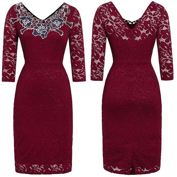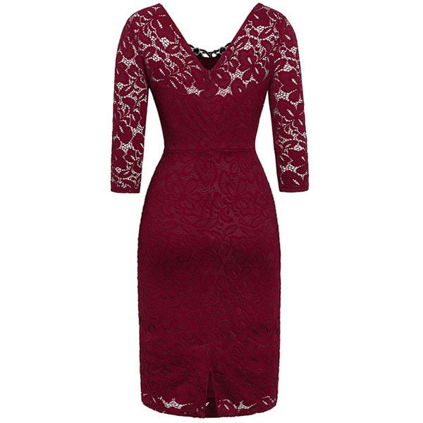 Exhibit your incredible style sense with this beautiful lace dress. The backless design can make you look sexier. Finished with 3/4 sleeve and a fit silhouette design,this dress can portray your slender figure. For your fancy events like dinner dates or weekend gatherings,you can trust in this dress to make you look stunning!
