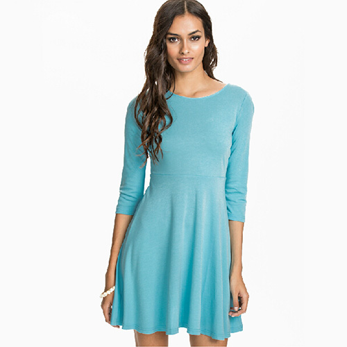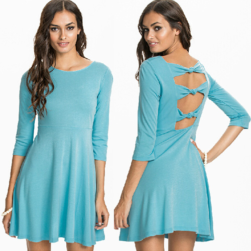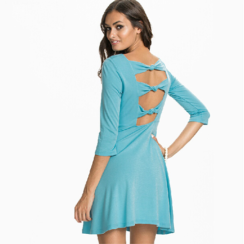This dress features solid color style,fashion and popular. Backless style,backside with bowknot for decoration,adding its sweet sense. Fashion round neck and 3/4 sleeve design. A perfect choice for you in summer.