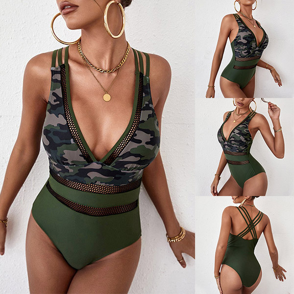 You can easily be the focus at the swimming pool or beach-side when you wear this one-piece swimsuit. The backless and deep v-neck design make it look so alluring,while the camouflage printed details will offer you a more eye-catching look. Just enjoy your swimming time with this swimsuit!