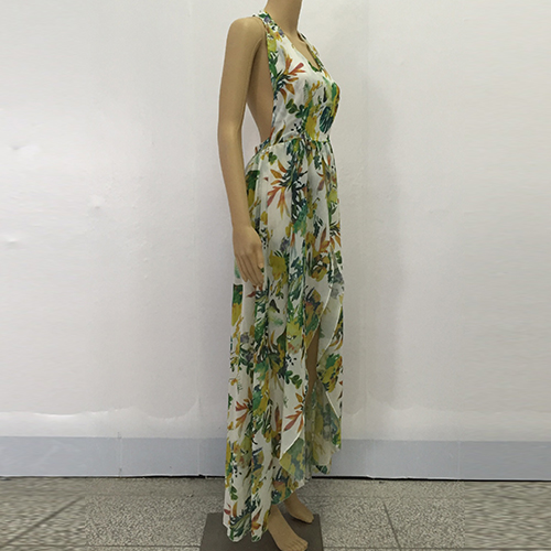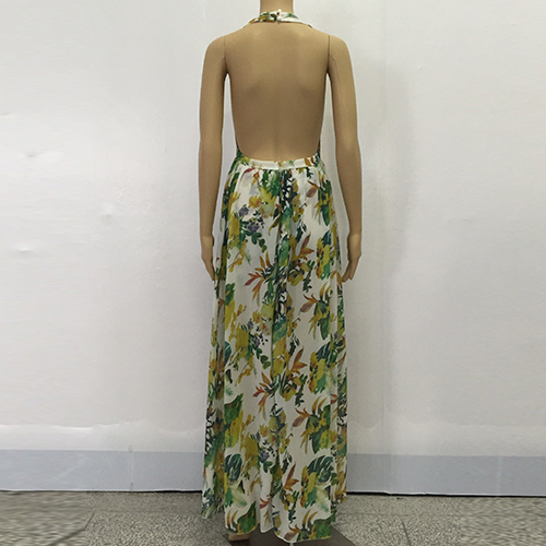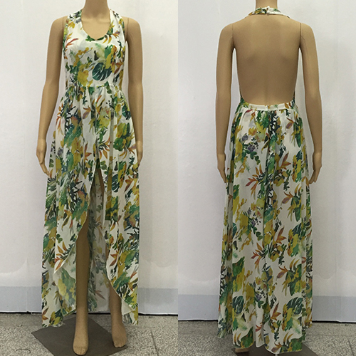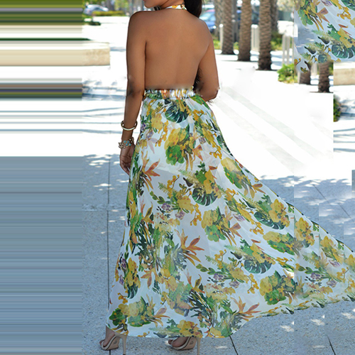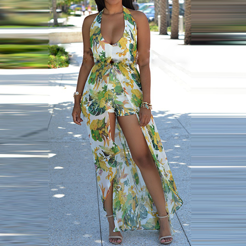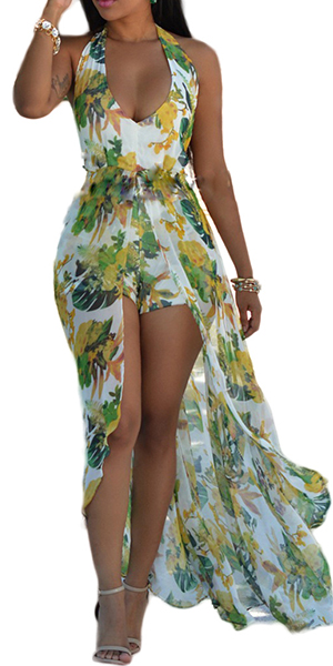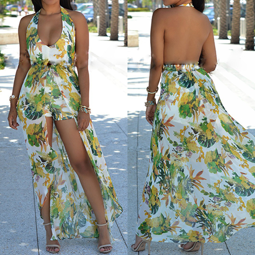Boasting a vibrant floral print,with backless,deep v-neck and chiffon spliced hem,this romper is the
