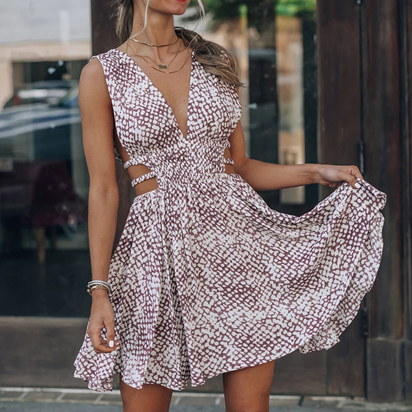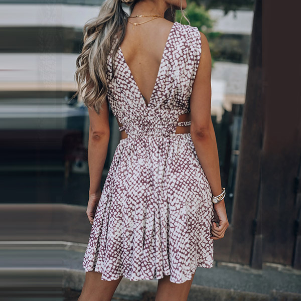 Sexy Backless Deep V-neck Hollow Out High Waist Printed Dress