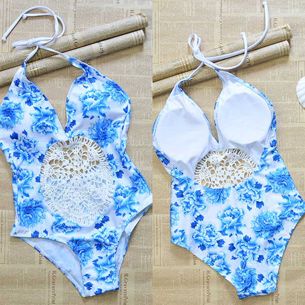 with backless,deep v-neck and hollow out lace spliced design,sexy and alluring. This swimsuit is a good way to make you
