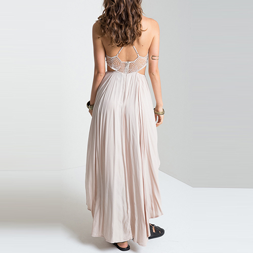 with backless,deep v-neckline,lace spliced and an irregular hem,sexy and sultry. Paired with some bohemian