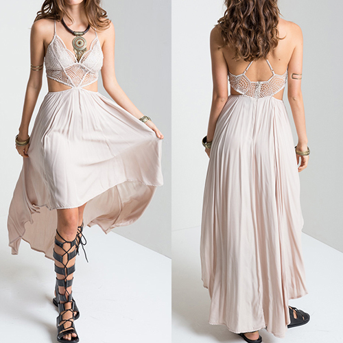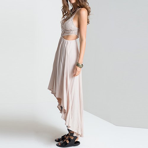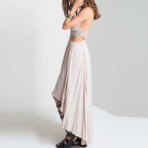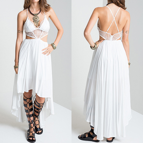 Sling style,designed with backless,deep v-neckline,lace spliced and an irregular hem,sexy and