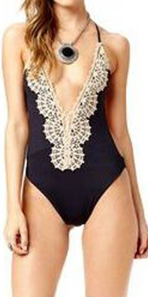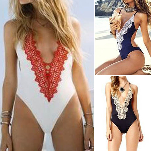 the seaside. One-piece style,designed with backless,deep v-neck and lace spliced details,sexy and sultry.