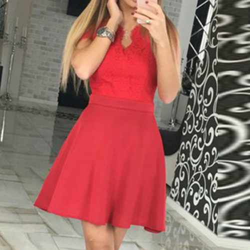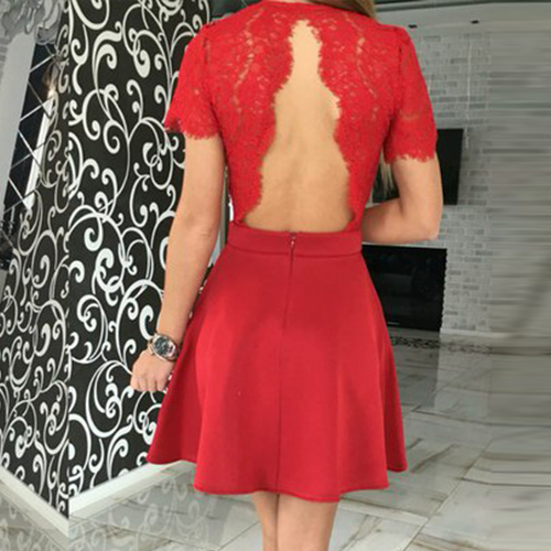 Sexy Backless Deep V-neck Lace Spliced Short Sleeve Dress