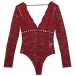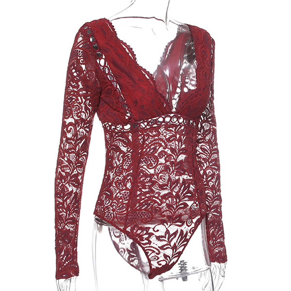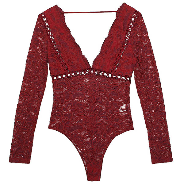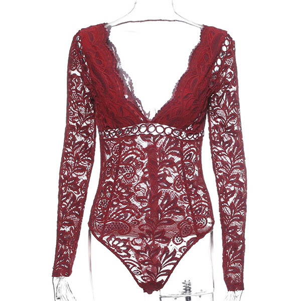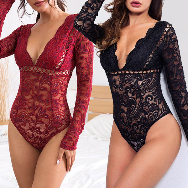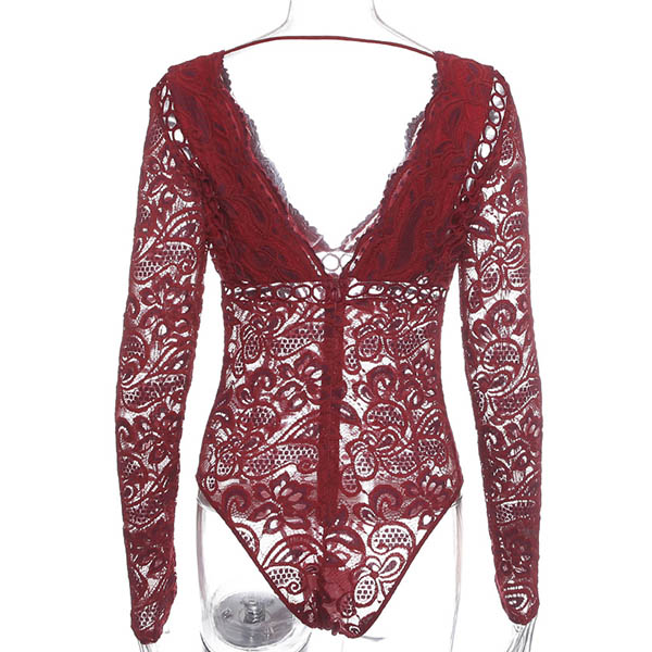 Sexy Backless Deep V-neck Long Sleeve See-through Lace Bodysuit