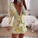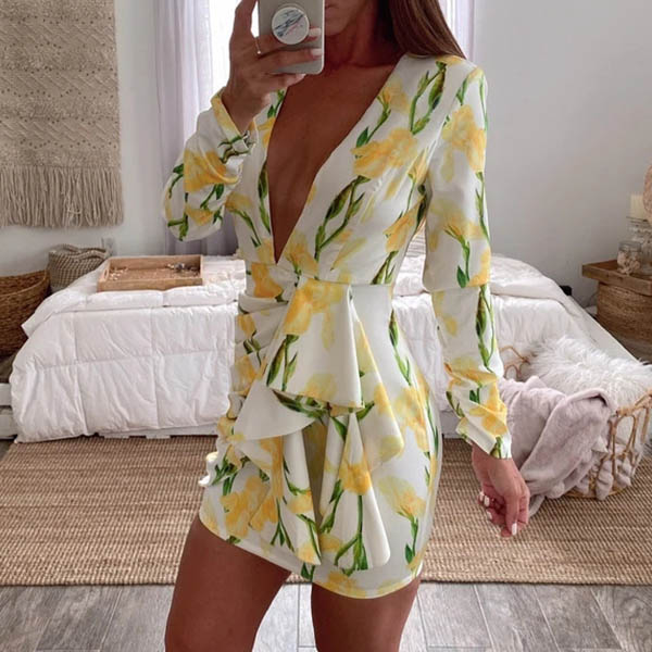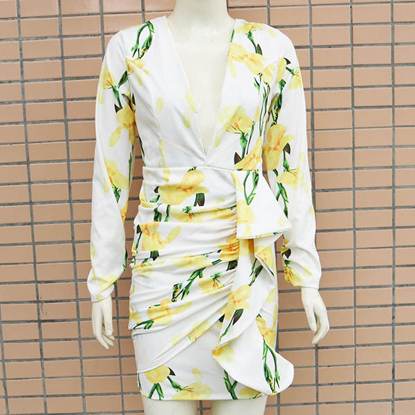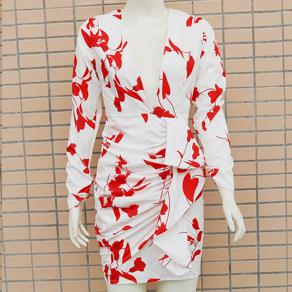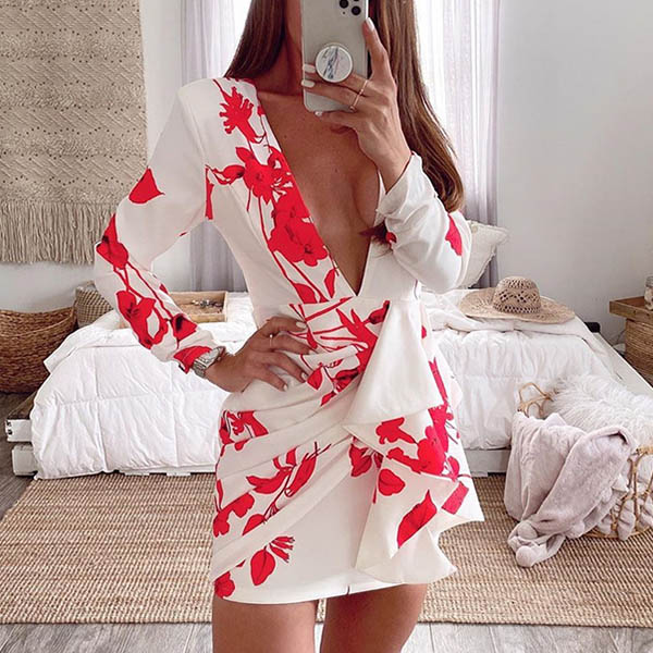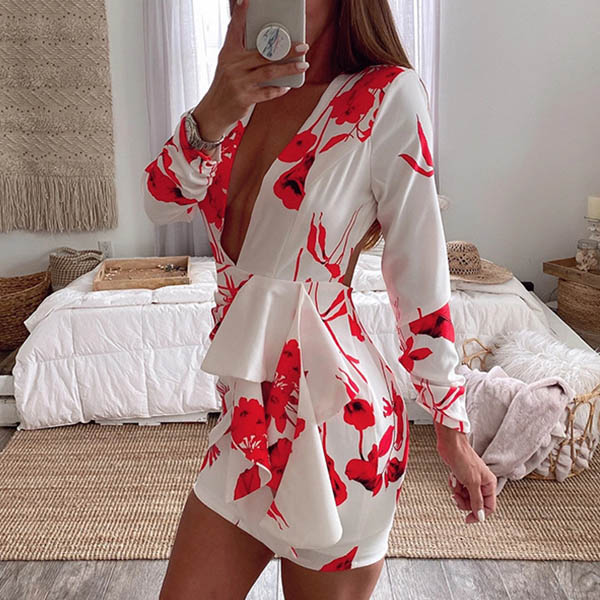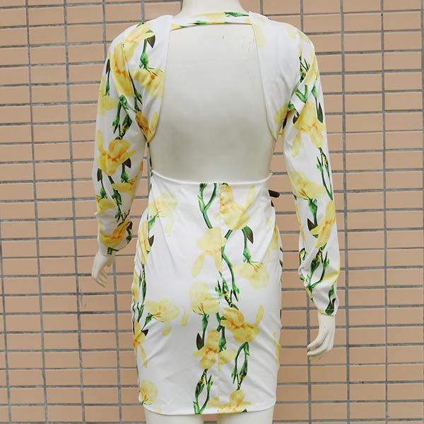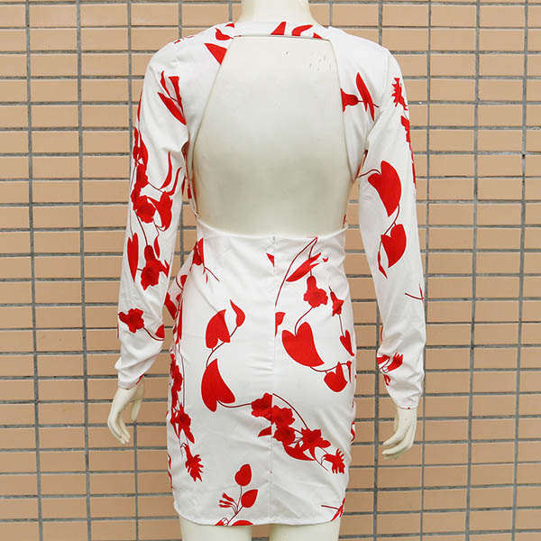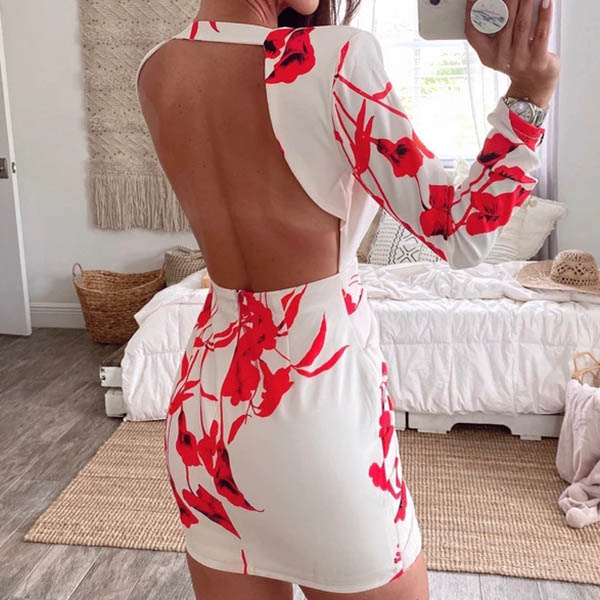 Sexy Backless Deep V-neck Long Sleeve Slim Fit Printed Dress