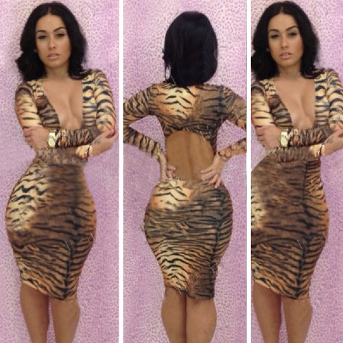 This dress features Ornithoctonus pattern design,unique and chic. Backless style and deep v-neck design,sexy and charming. Long sleeve,slim fit and package hip design,outline your seductive curve and make men drool through this dress.