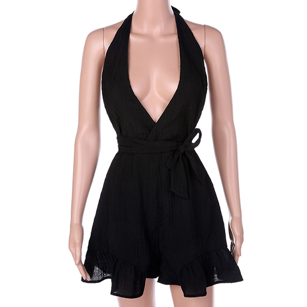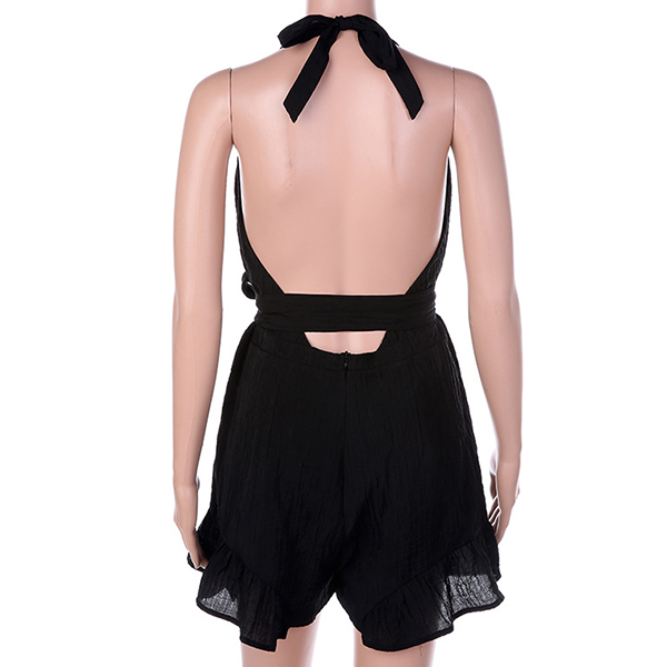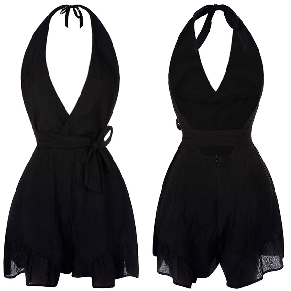 accompanied with backless,deep v-neck and a ruffle hem,this halter romper makes it easier fro you to stand out in the crowd.