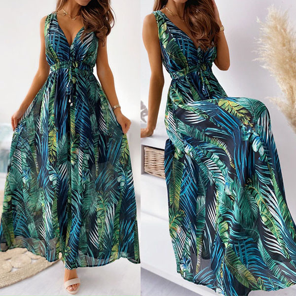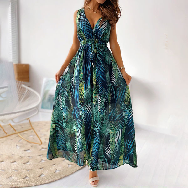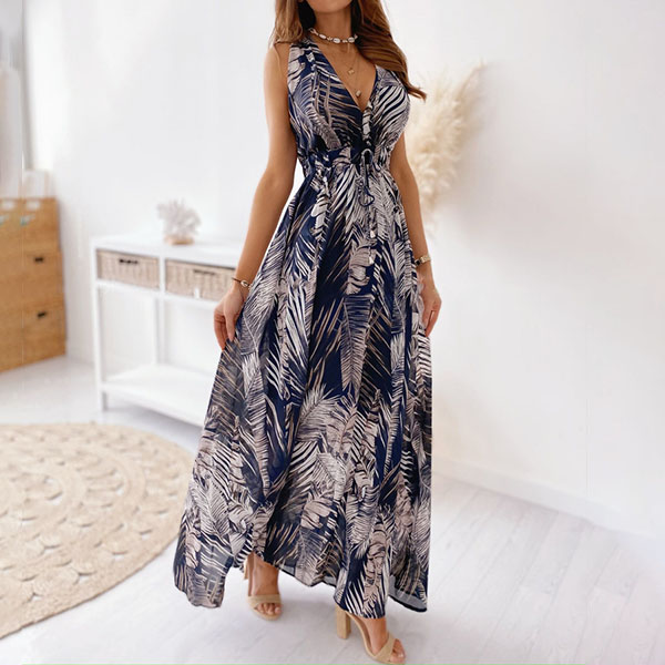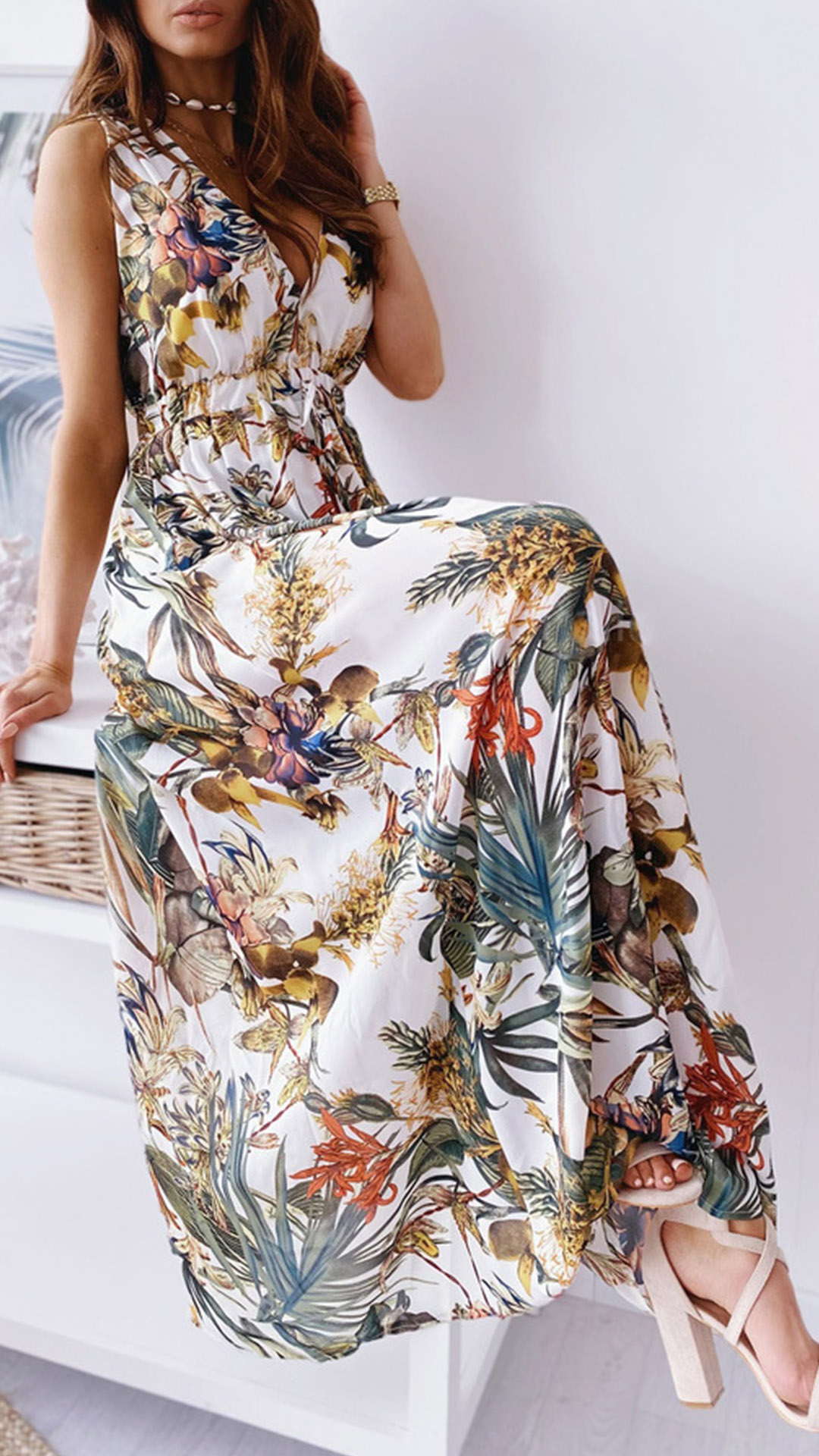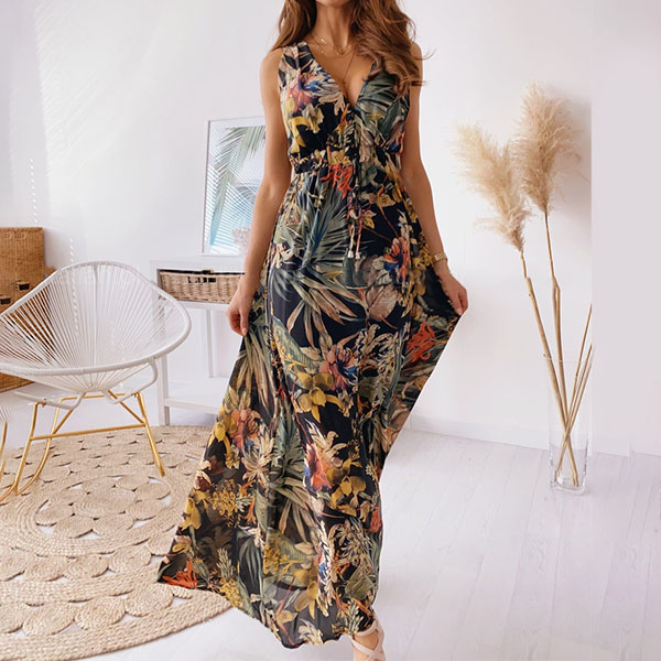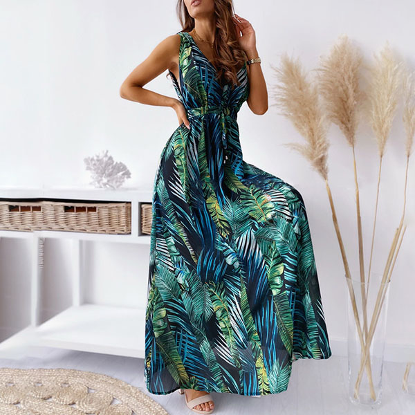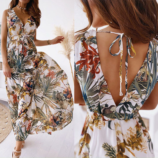 Sexy Backless Deep V-neck Sleeveless High Waist Printed Maxi Dress