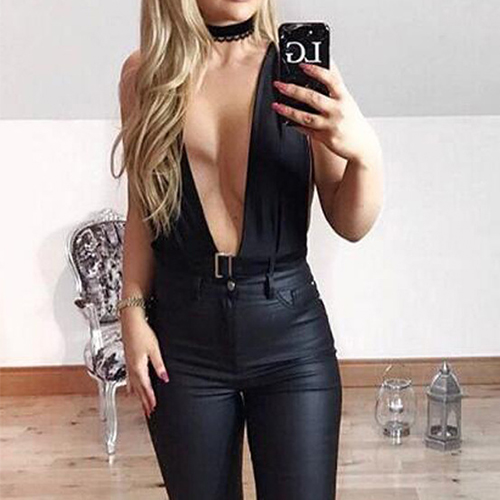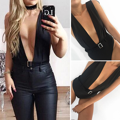 Slip into this sleeveless bodysuit for a sexy and sultry look. Solid color style,with backless and deep v-neck