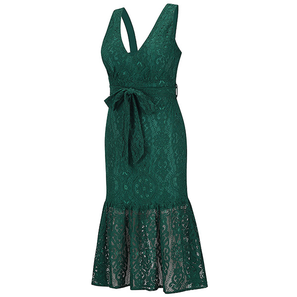Sexy Backless Deep V-neck Sleeveless Tie-belt Lace Dress