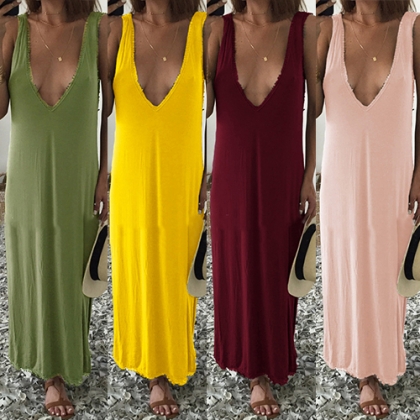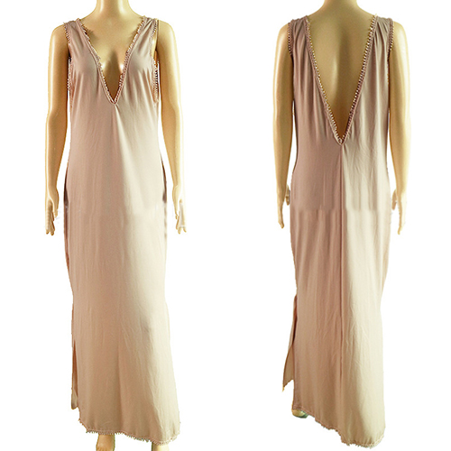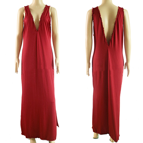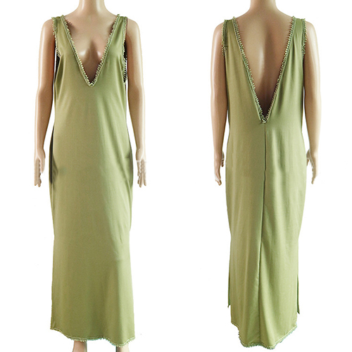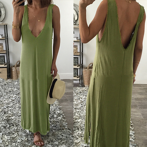 Solid color style,its v-shaped backless and deep v-neckline with lace spliced details and its slit hem make this piece look