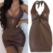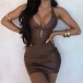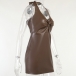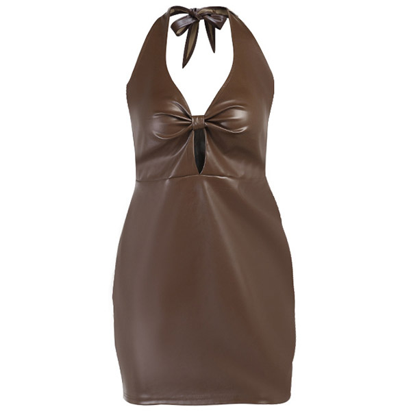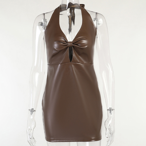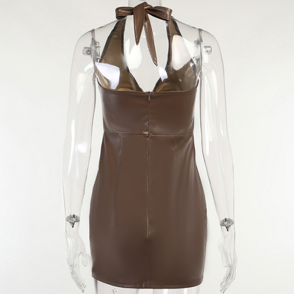 Sexy Backless Deep V-neck Solid Color Slim Fit Halter PU Leather Dress