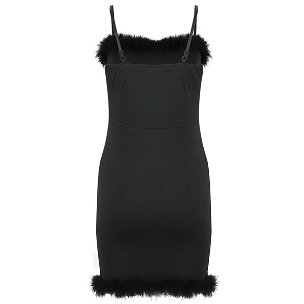 When stepping into a night party with this little stunner,you can easily arouse a splash. Sling style,with backless and faux fur spliced design,sexy and alluring. The flattering black tone and fit silhouette design can amplify your perfect curve. Dress it up with your sexy heels for an amazing look!