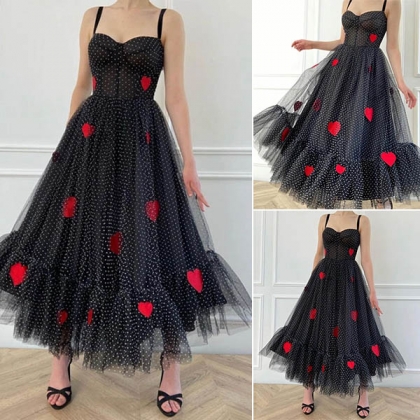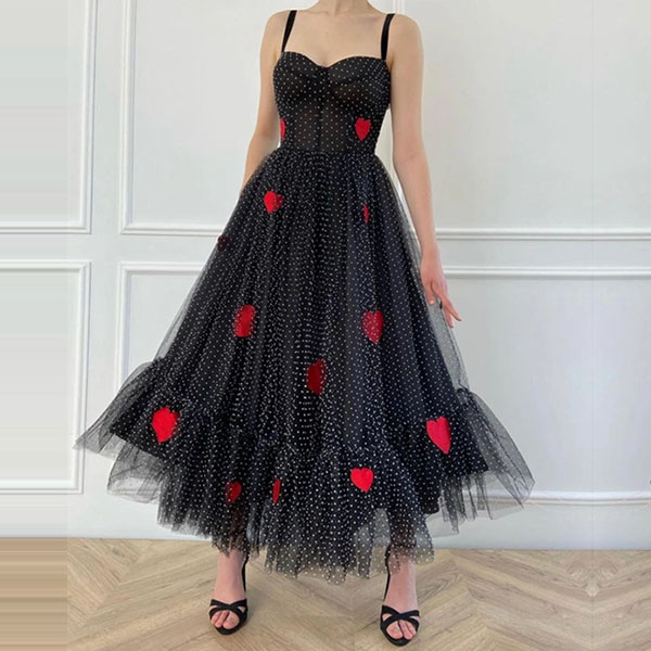 For an evening look that is full of sexy and flirty vibes,we suggest you choosing this piece! Sling style,with backless and gauze spliced design,which can offer you a more alluring look,while the heart printed details will make this piece look more eye-catching. Save this wonderful piece for your fancy events.