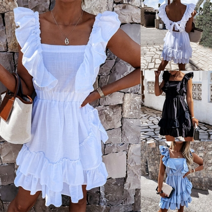 Sexy Backless High Waist Sleeveless Solid Color Ruffle Dress