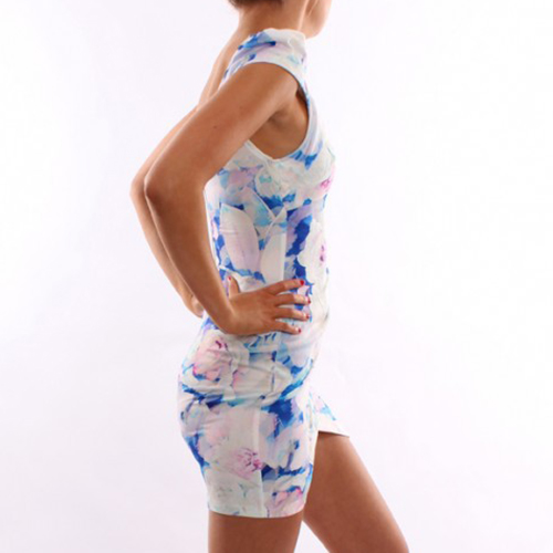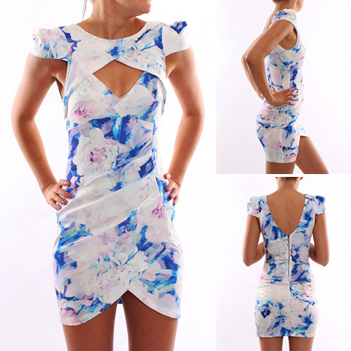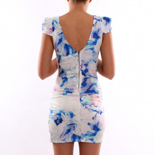 in your wardrobe ensemble. Boasts vibrant floral print,accompanied with cap sleeve,backless,an irregular hem,a fit silhouette