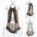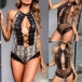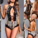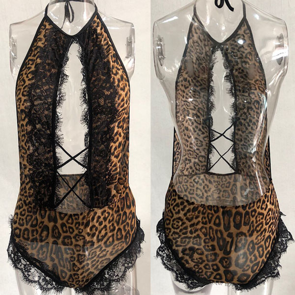 Sexy Backless Hollow Out Lace Spliced Leoaprd Printed Halter Bodysuit Lingerie