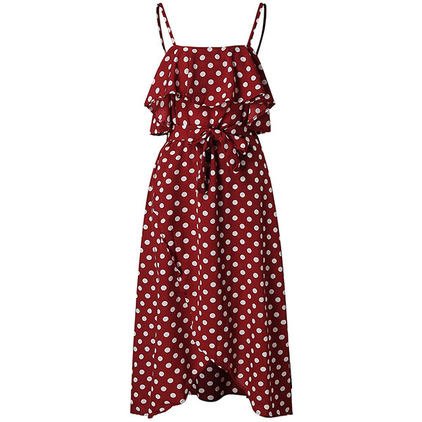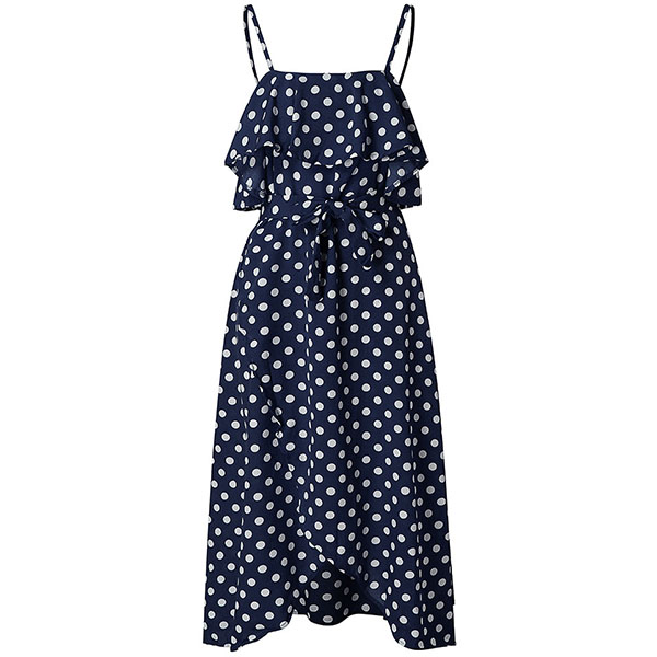 Hey,girls,you can just step out to greet the sun-soaked summer days with this relaxed dress. Sling style,with backless and an irregular hem design,sexy and charming. The dots printed details and ruffle design will make this piece look more playful and sweet. Perfect fit for your night dating and weekend trips.