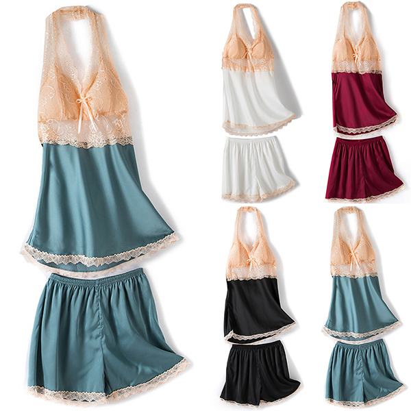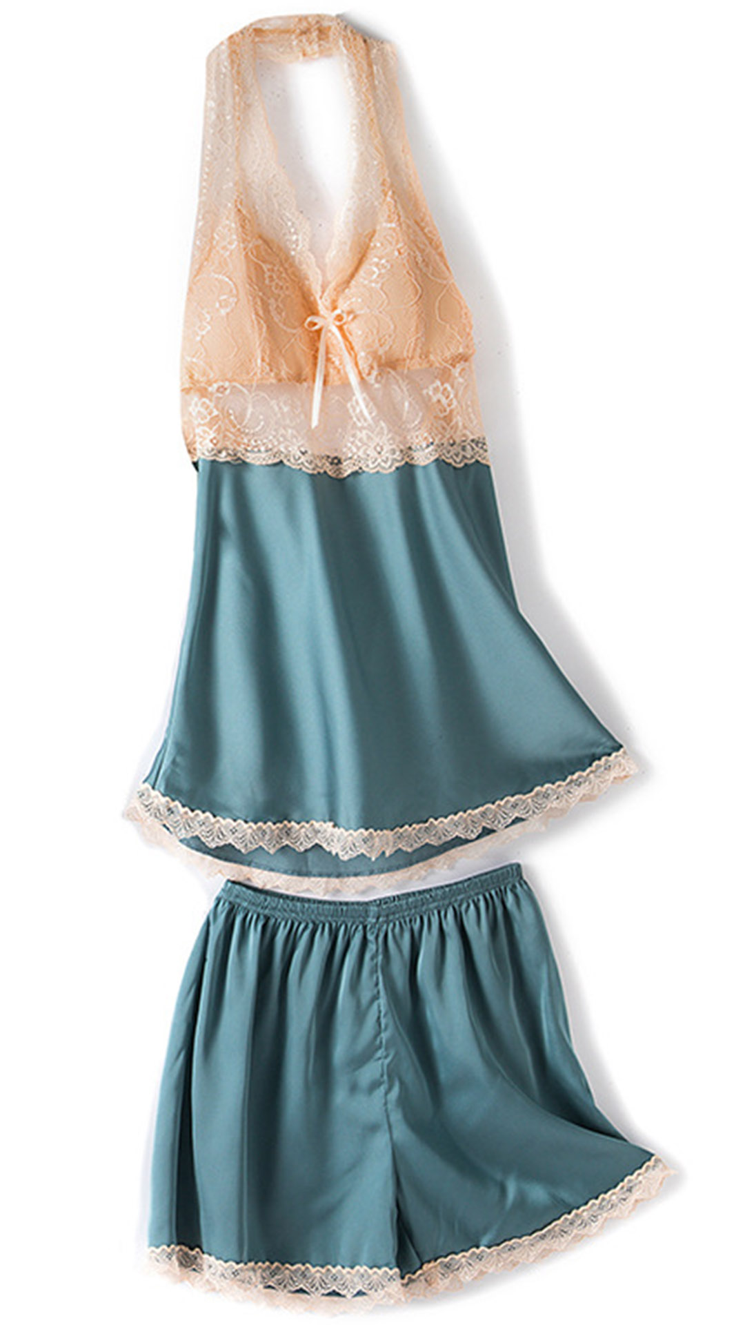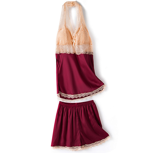 Sexy Backless Lace Spliced Halter Top + Shorts Nightwear Set