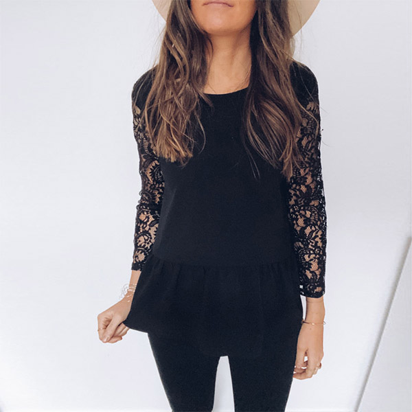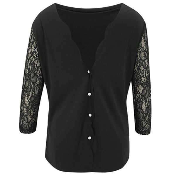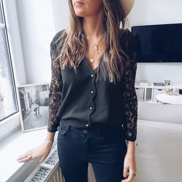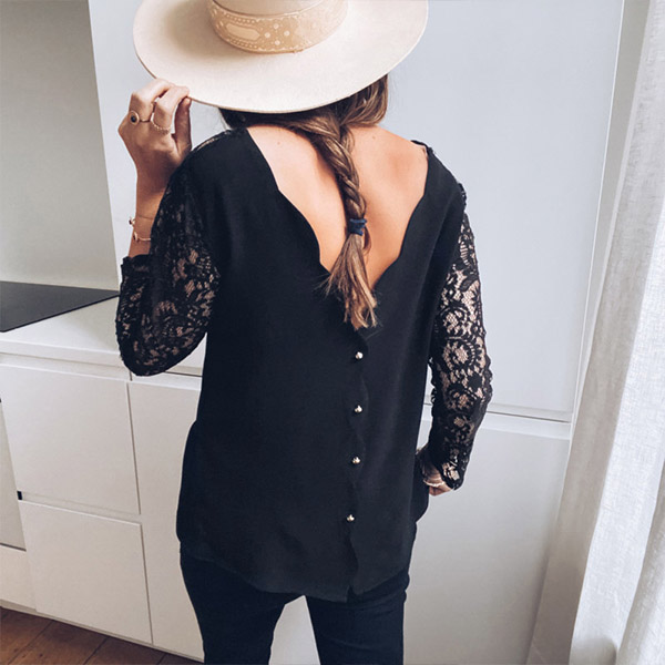 This top comes with a classic yet flattering black tone,the backless and lace spliced long sleeve design will make this piece look more alluring. The back button design will further enhance its charm. Attracted? Then invite it to your wardrobe!