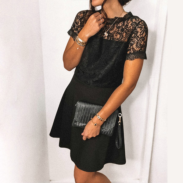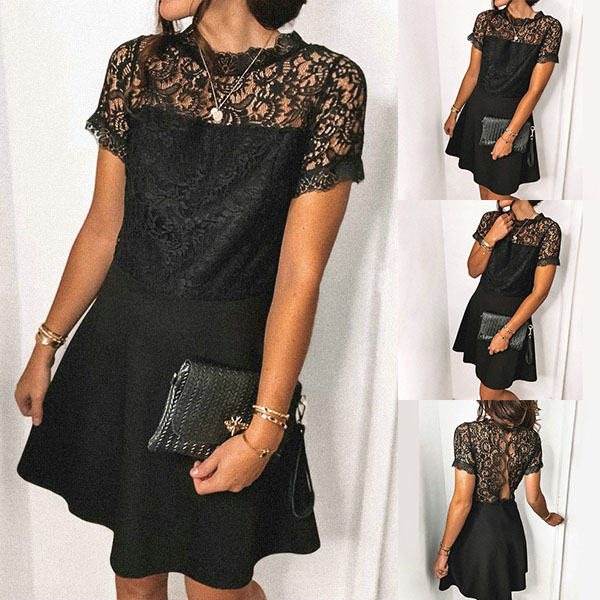 Hey,girls,when you wanna exude your sexy and flirty side,you can just slip into this A-line dress. The backless and lace spliced details will make this piece look more alluring and attractive. Finished with short sleeve and round neck design,this dress can give you a perfect transition form your daytime out to night dating.