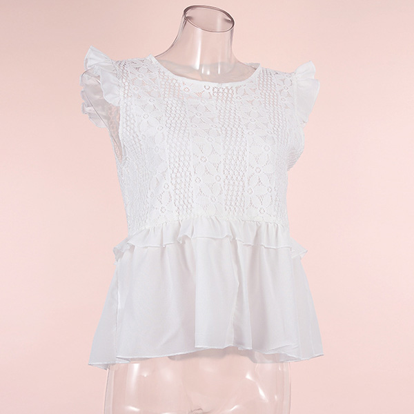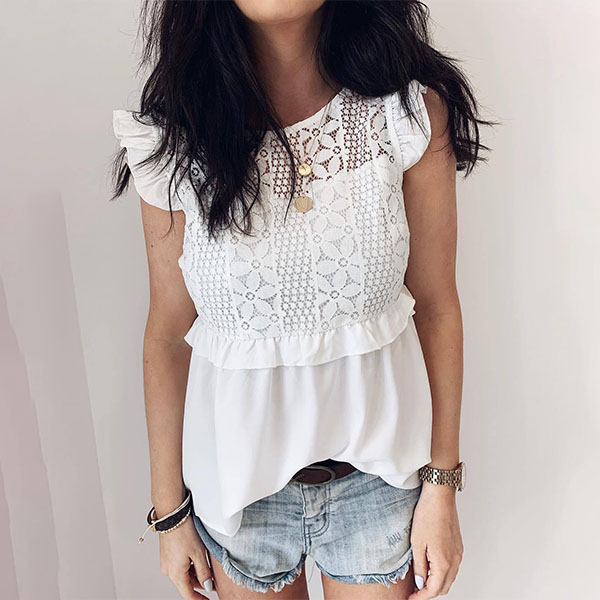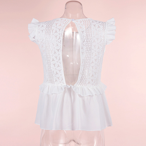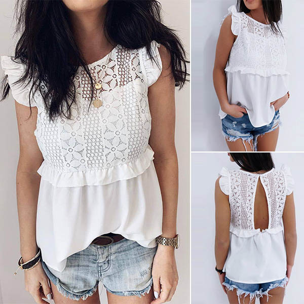 When the summer season hits,this sleeveless top is worth to be your wardrobe staple. The backless,lace spliced details and ruffle design at the cuff part make this piece look so attractive. We thing matching with a tight pants would make you full of style and charm.