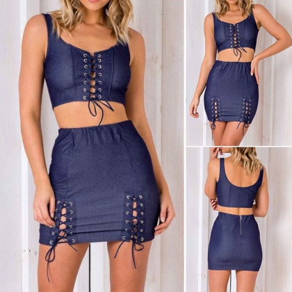 backless sleeveless crop top and a high waist mini skirt,accompanied with a super fit silhouette and lace-up details,