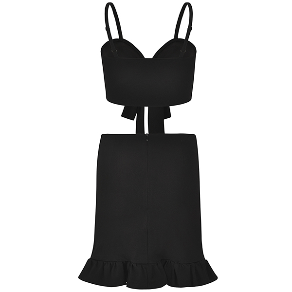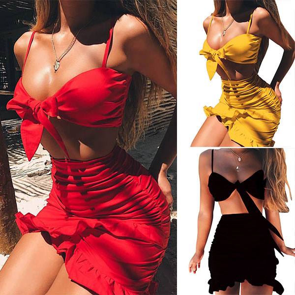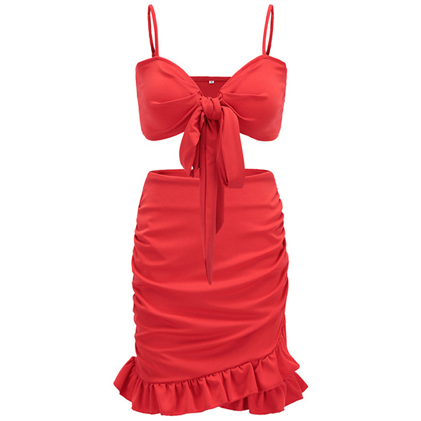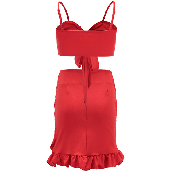 You can easily arouse a splash when you dress yourself up with this two-piece set. Solid color style,including a sling crop top and a high waist skirt,its alluring design details like backless,ruffle hem and lace-up design can offer you a sexy and flirty look. You can easily stand out in the crowd when you don this two-piece set.