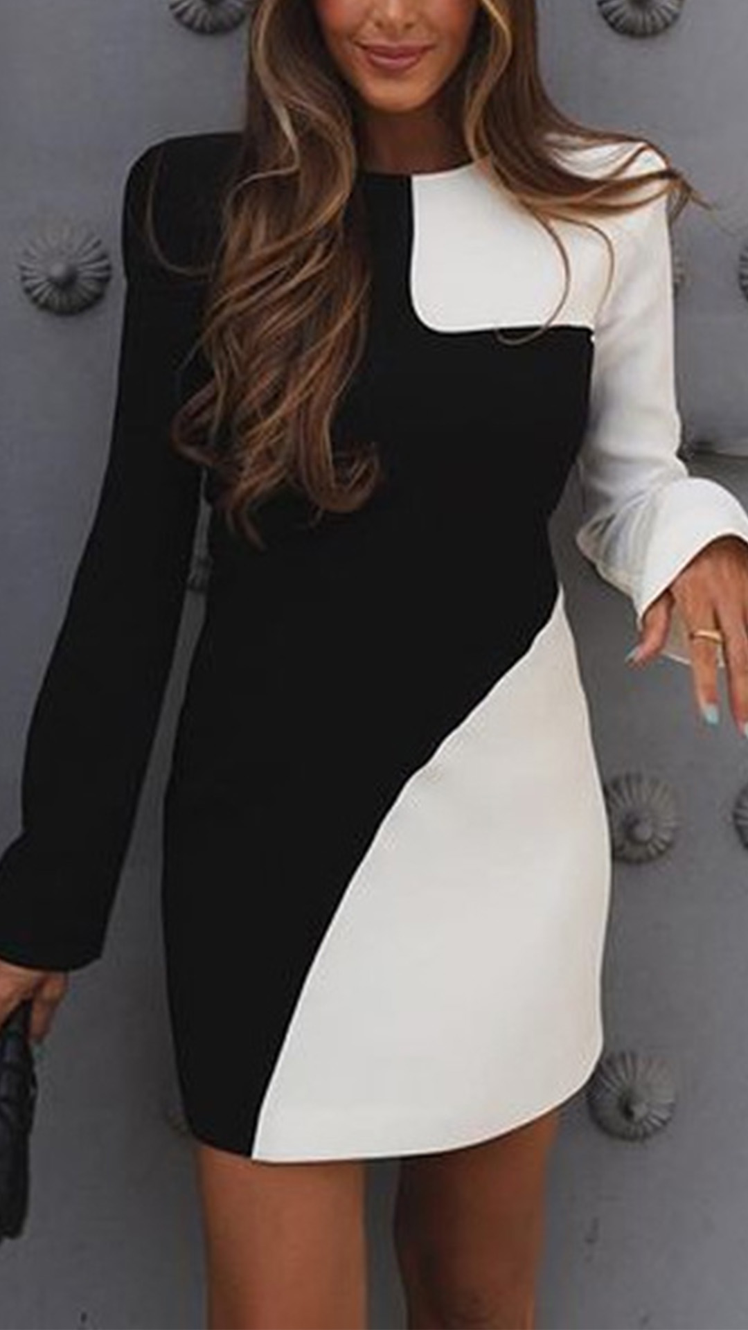 The classical collision of white and black tone,this dress creates a sassy creation. Finished with long sleeve,round neck and a fit silhouette,this dress can showcase your slender figure. Moreover,the backless design will offer you a more alluring look. When invited to a night party or weekend gathering,you can trust in this dress to express your beauty and charm.